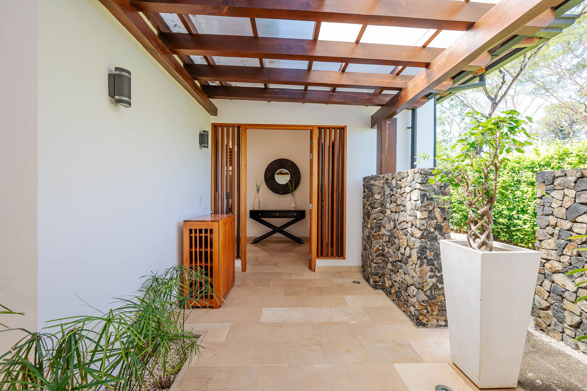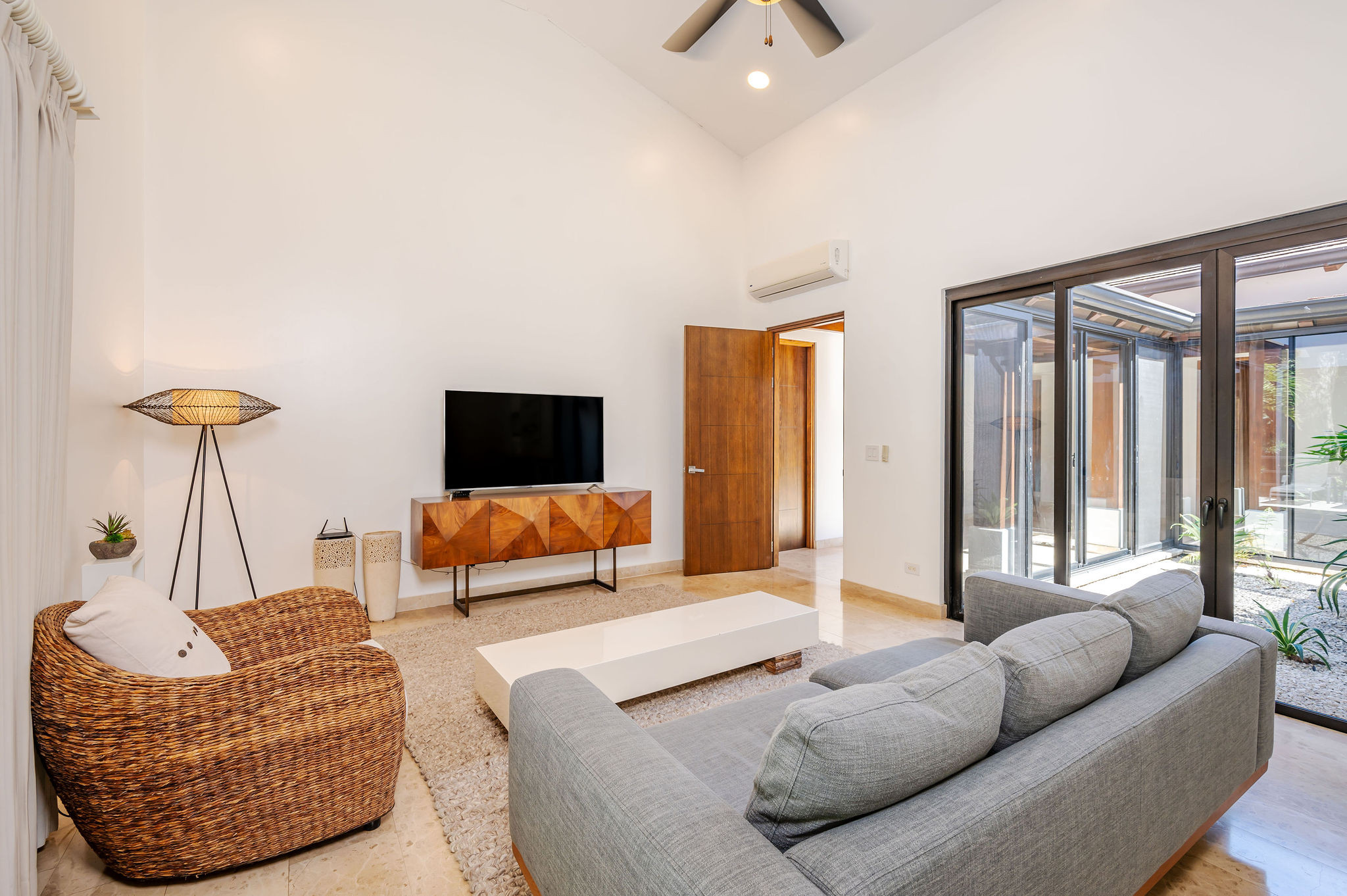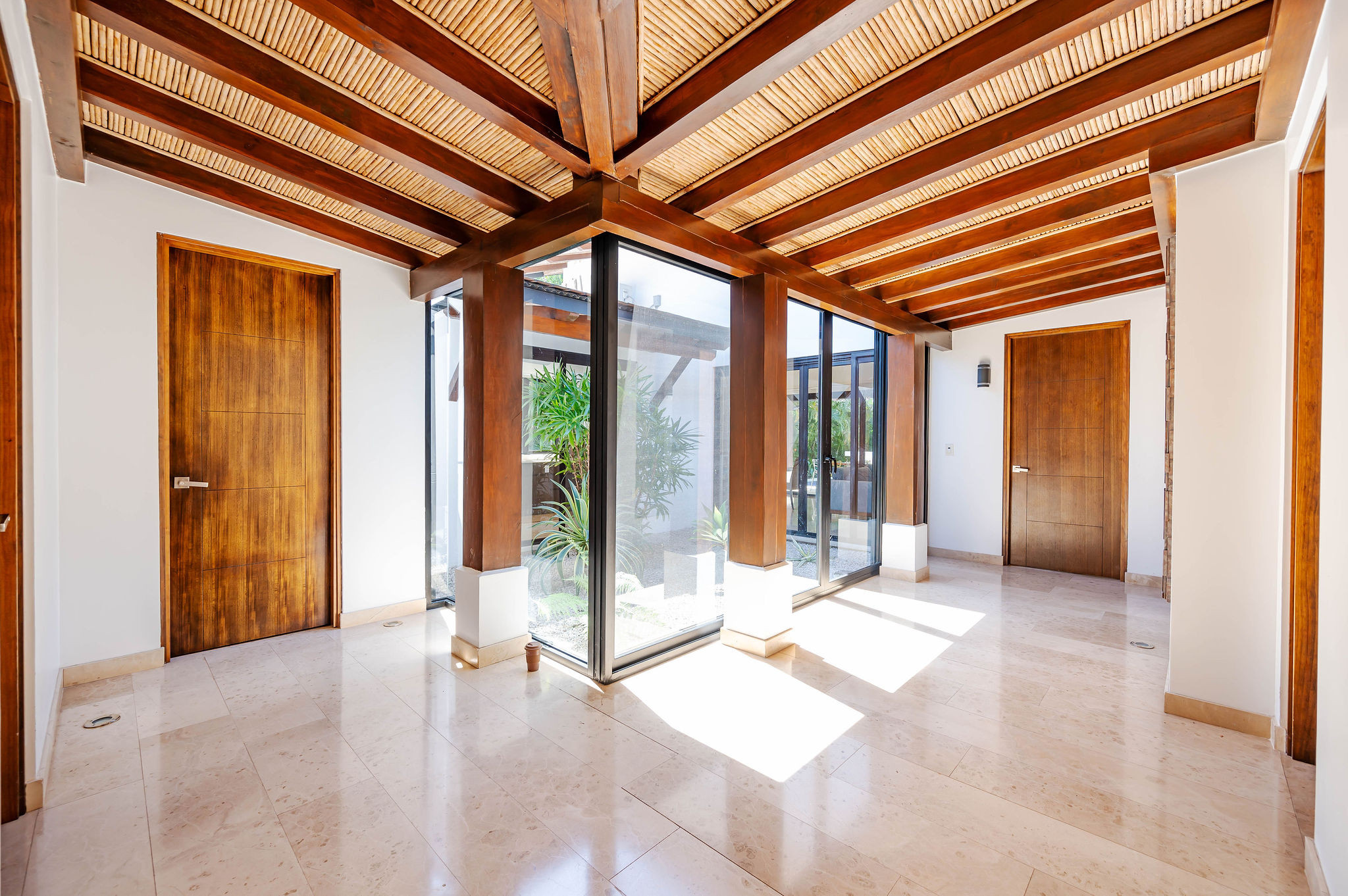 From the moment you arrive, an interior zen garden fills the home with natural light and creates a serene, welcoming atmosphere. The social areas—living room, dining area, and modern kitchen—flow seamlessly into the outdoors through glass doors that open onto an elegant terrace.